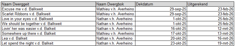 | Romance v.d. Balkweit | Ismael v. Averheino | 30-09-20 | 25-02-2021 | 1 br geitje 1 zwst bokje |